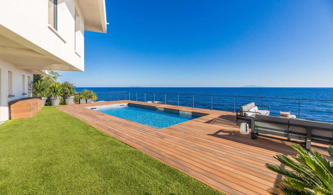 La terrasse est bien sûr sublimée par cet emplacement exceptionnel les pieds dans l'eau. L'intérieur de la piscine a été entièrement rénové avec une membrane armée gris anthracite à effet texture pierre, créant un contraste saisissant avec la teinte chaude des lames Ipé.